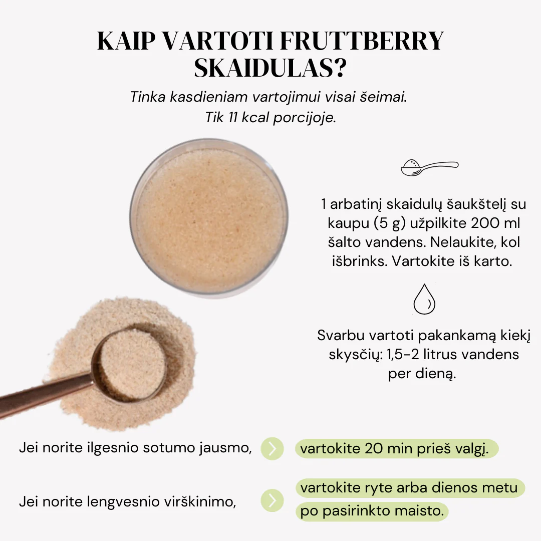 Vartojimas: 1 arbatinį šaukštelį su kaupu (5 g) užpilkite 200 ml šalto vandens. Nelaukite, kol išbrinks, išgerkite iš karto. Vartokite 1–2 kartus per dieną, prieš valgį. Svarbu vartoti pakankamą kiekį skysčių – 1,5–2 litrus vandens per dieną. Naudoti reguliariai. Produkto sudėtyje yra natūralių cukrų.