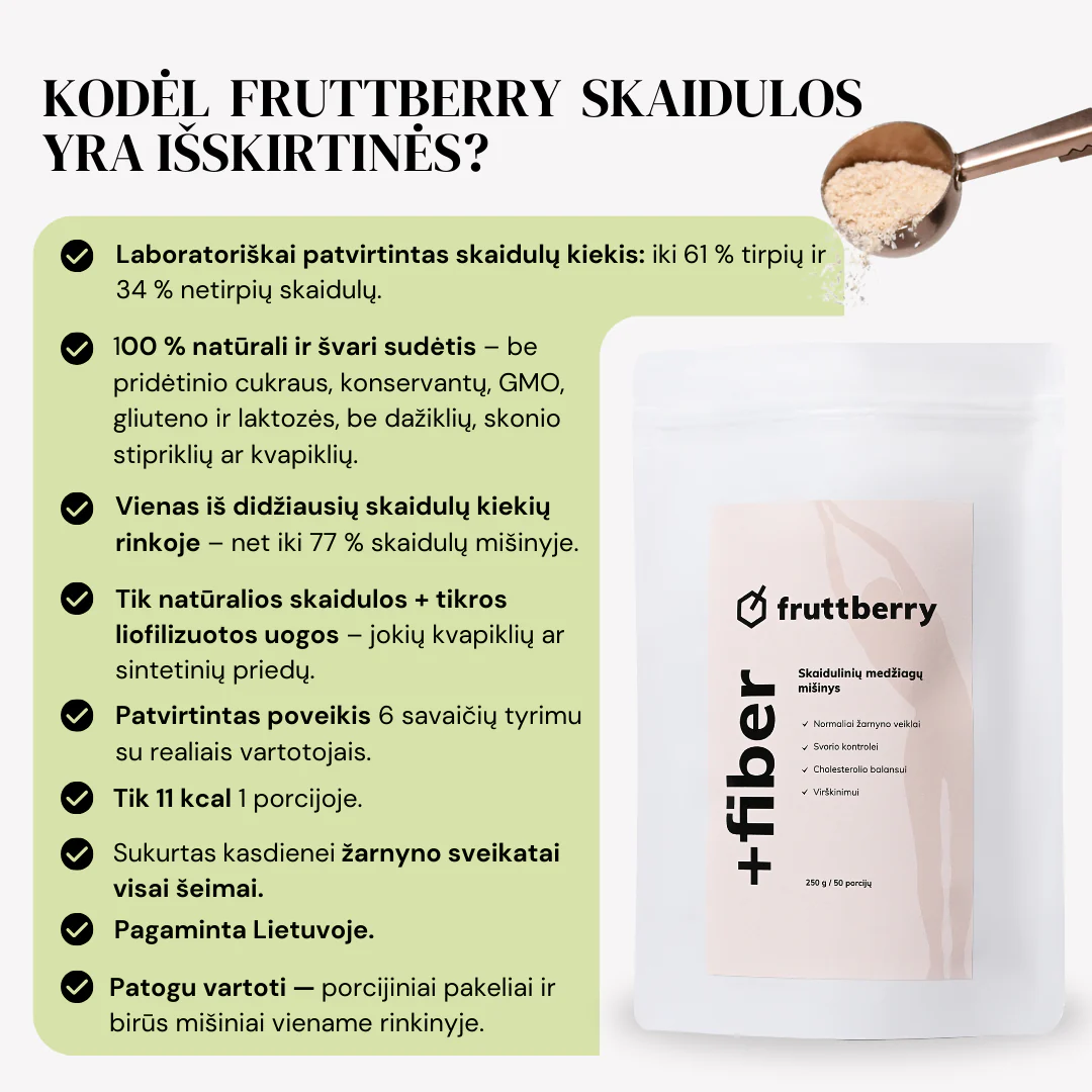 | Skaidulinės medžiagos | 76 g | 3,80 g |
