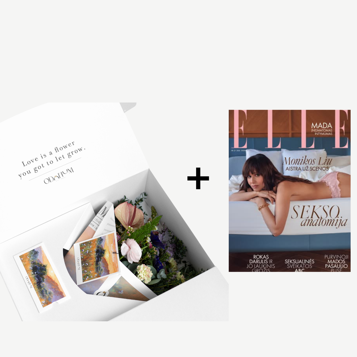 - Dovanos komplektas: gėlės dėžėje + „ELLE Lithuania” žurnalas
