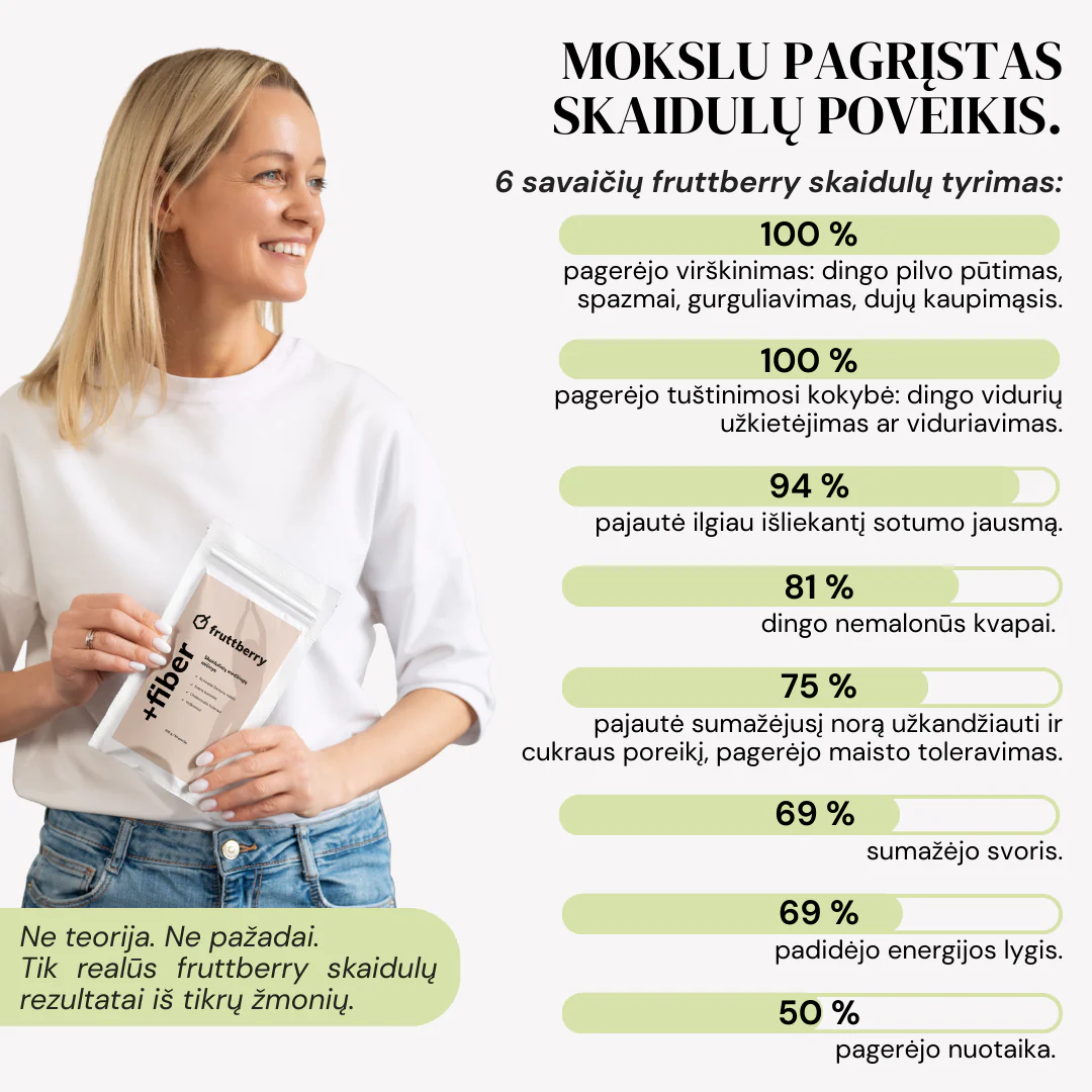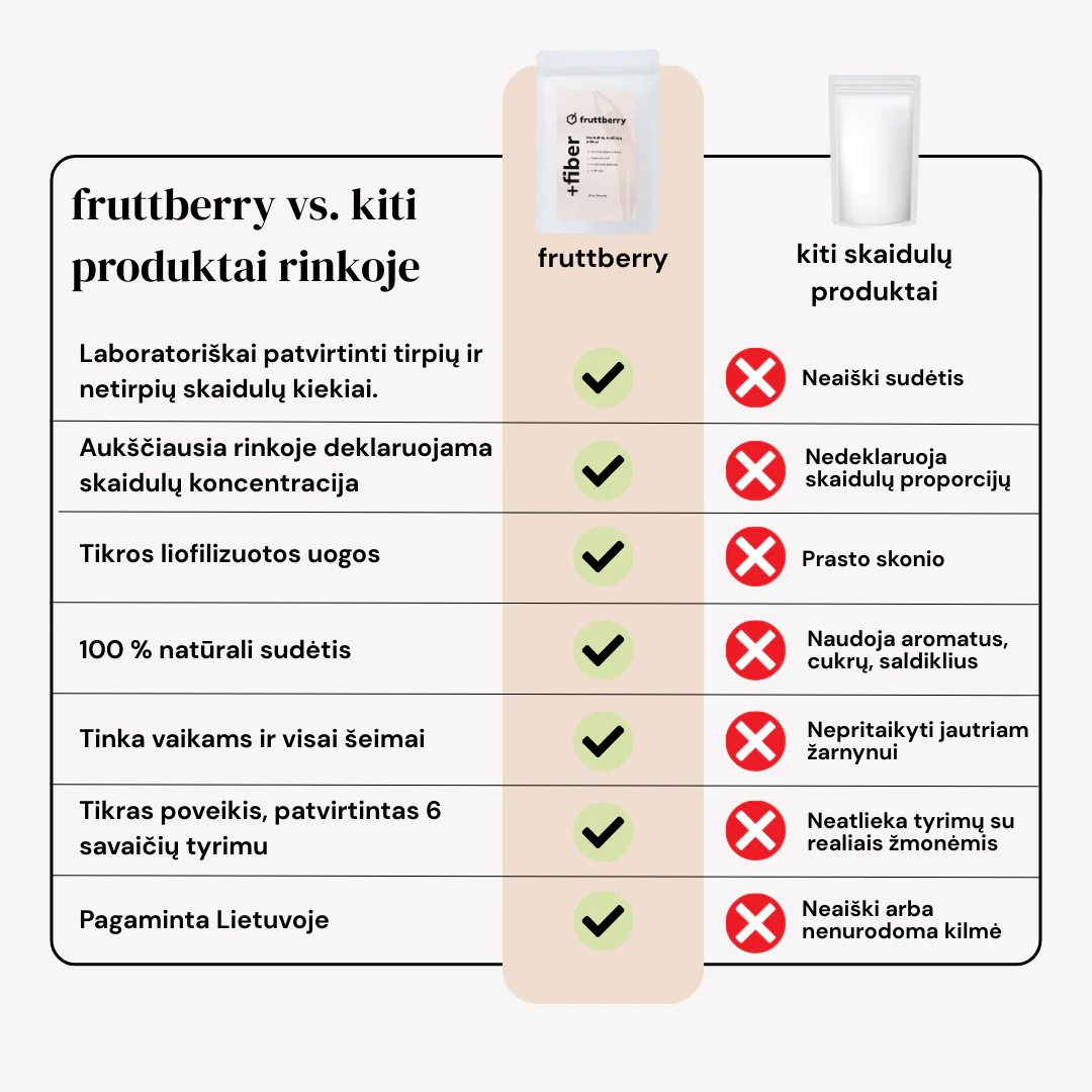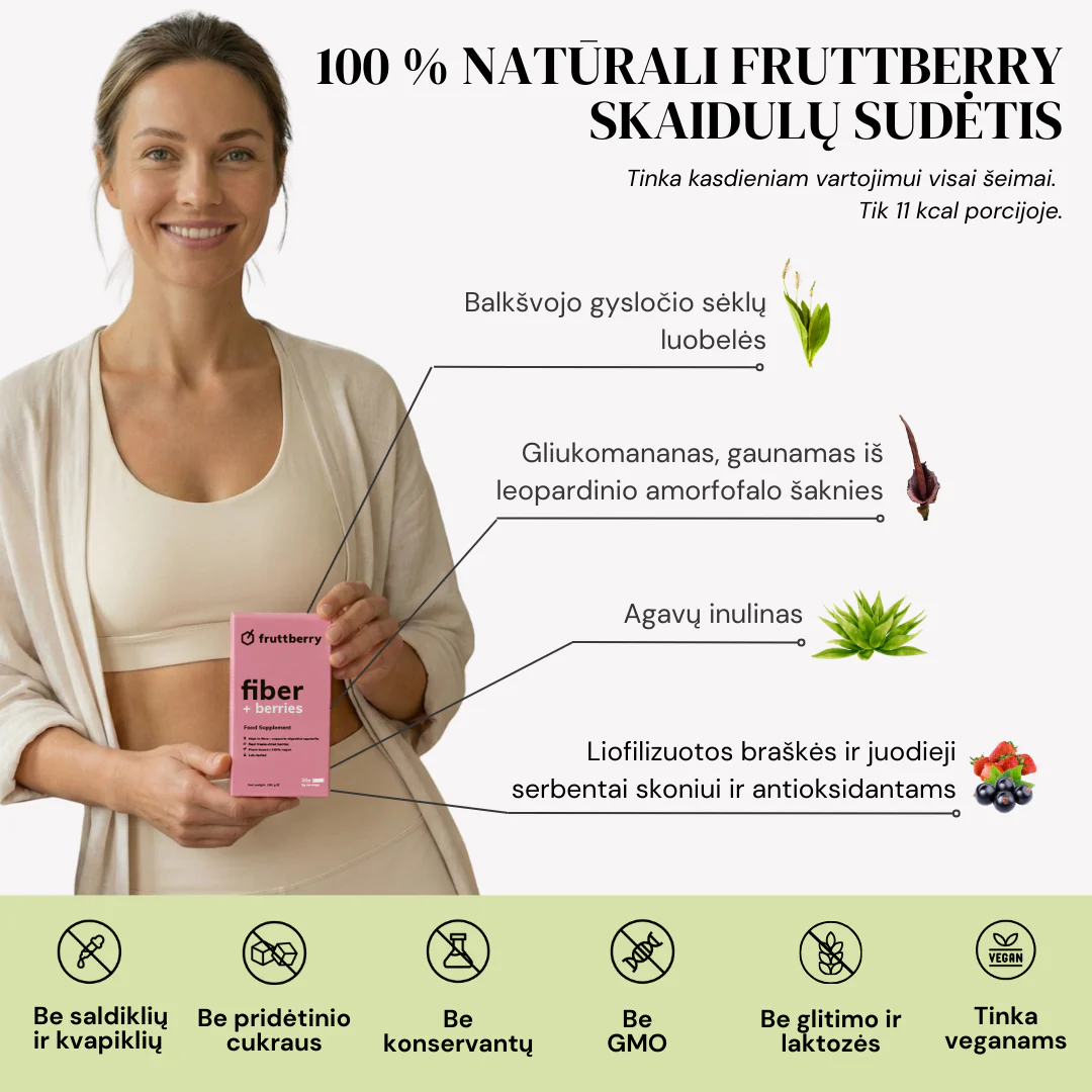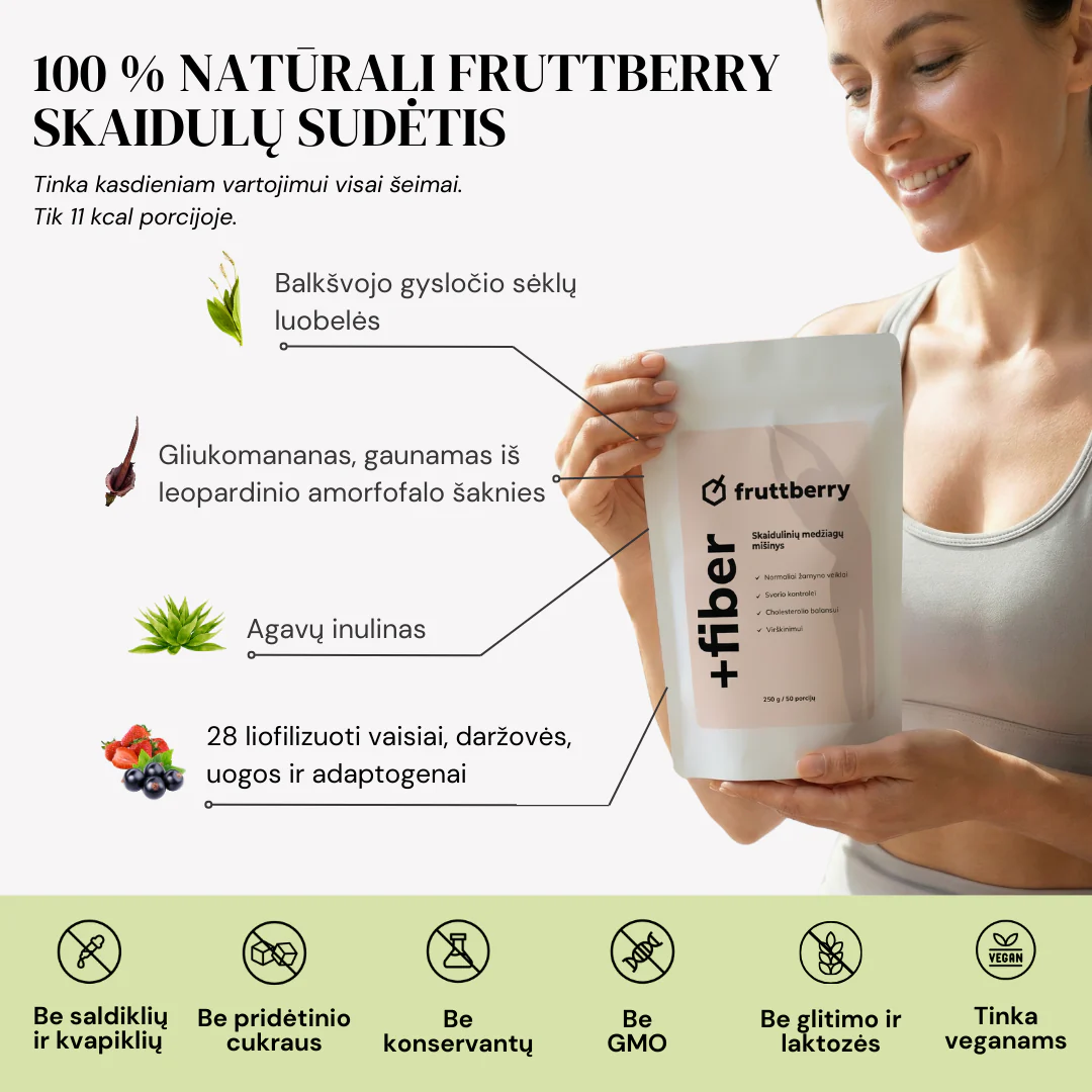 fruttberry skaidulinių medžiagų mišinys +fiber, sudėtyje taip pat yra net 31 skirtingos daržovės, vaisiai, uogos ir adaptogenai, praturtinantys mišinius skaidulomis, vitaminais, mineralais ir antioksidantais.