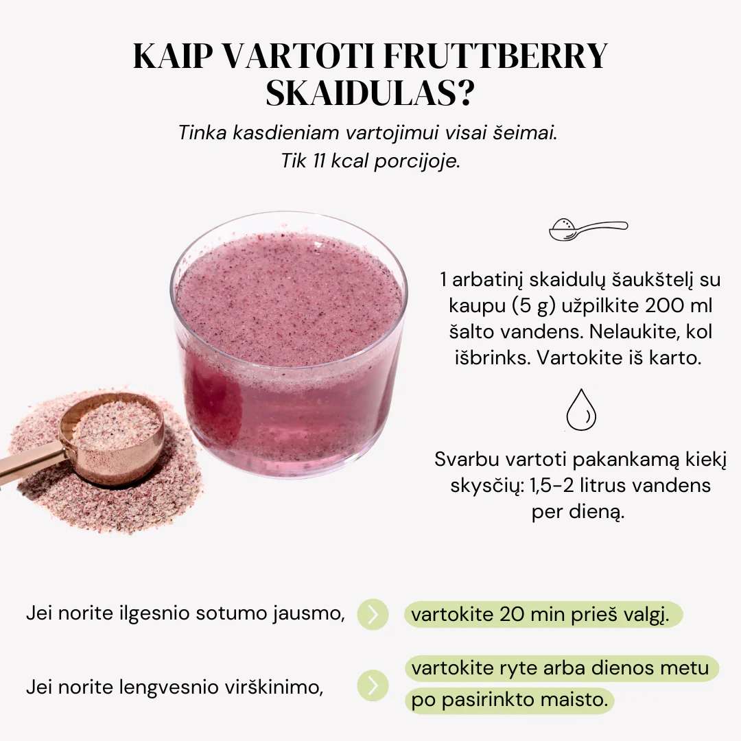 Naudai pasiekti mišinį rekomenduojama vartoti kasdien, bent tris mėnesius iš eilės. Šiuo mišiniu galima pagardinti košę, jogurtą, vaisių kokteilius arba gerti kartu su kitais fruttberry linijos mišiniais.